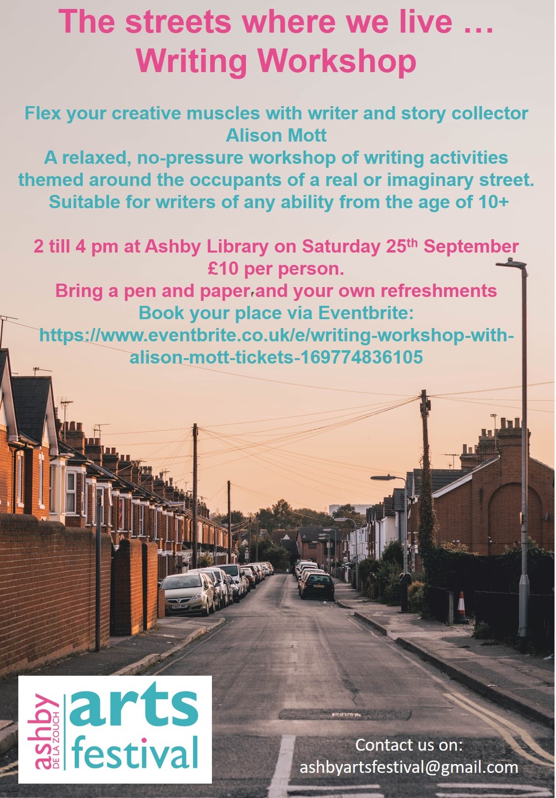 I’m chuffed to bits to be invited to run a writing workshop this month for Ashby Arts Festival, roughly a year and a half after the last one I planned was cancelled because of the pandemic.