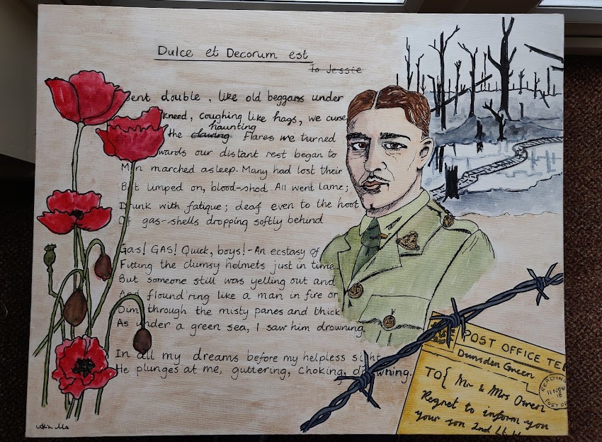 In the end I chose to do a collage themed on Wilfred Owen and his poem ‘Dulce et Decorum est’. We looked at a photo of his handwritten version of this at Uni, once, to reinforce the idea that all writers – even internationally-known, iconic war poets – don’t get their creations ‘right’ first time.* I decided to use this ‘corrected’ version in the painting to humanise the poet, and to include a fictional depiction of the telegram Owen’s parents received on the morning of the Armistice itself, informing them of his death. I still like the elements I chose but would add them differently if I were to do the painting again – not least because handwriting on textured canvas with permanent art pens was a nightmare! But nevertheless I was quite pleased with the finished piece, and found sitting and working on it to be a wonderful, mindful exercise. Very different to the deeply focused buzz I get from writing, but very enjoyable all the same.