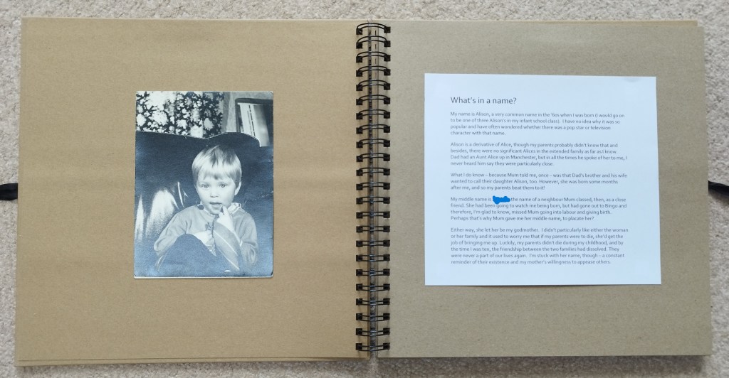 I’m using the sessions as the impetus for me to do the same, and as a scrapbooker, have chosen to print each piece off and stick it in a £5 album I bought from a local stationer’s shop. Putting it together quickly before last Friday’s Facebook Live session meant it’s not as ‘scrapbooked’ as I’d like (not least because I lent my papers and cutters to someone and need to ask for them back!) But they give an idea of what can be done – and I’ll be showing other ideas over the remaining 4 weeks.