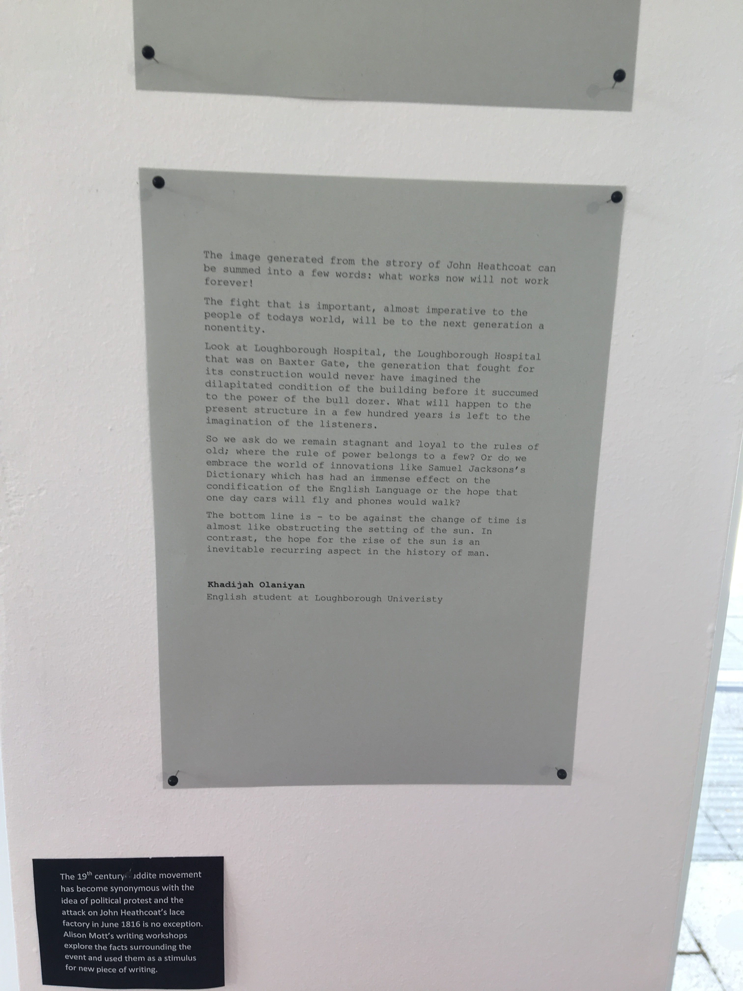 I was engaged by the project coordinator to lead a writing workshop for adults at Loughborough’s Charnwood Museum and a day of creative writing activities in conjunction with Nottingham-based artist Chiara Dellerba with Year 5 pupils at a local primary school. I collated the written work produced during both workshops, for display at the end-of-project exhibition at Loughborough University in May.